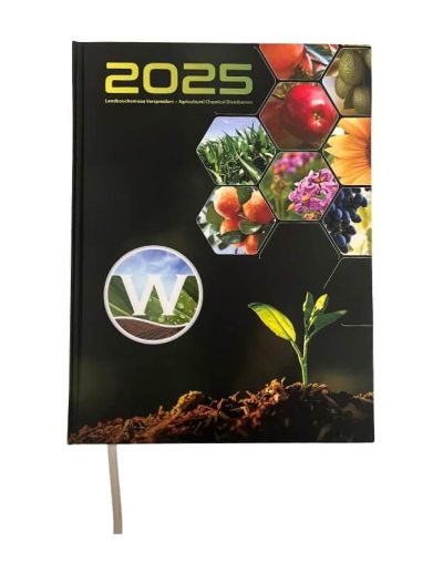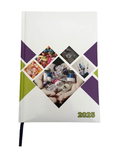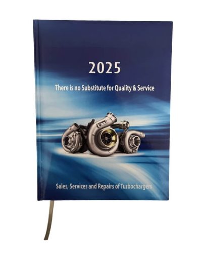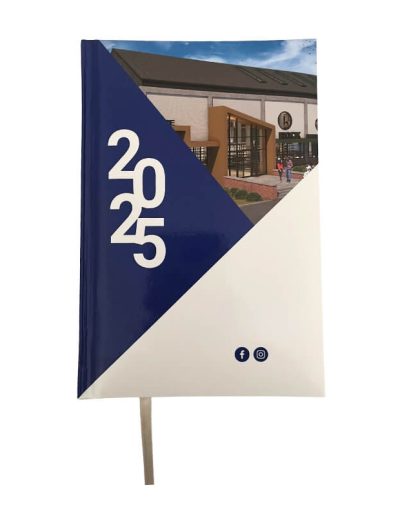 These covers can be printed silk screened with personalised end papers and printed ribbons to brand clients name.